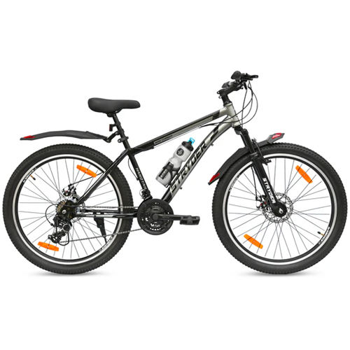 Specification Details Specification Details Frame 26Tx17 MIG Welded Steel Frame with Water Decals Fork Threadless Suspension Fork Tyre & Tube 26TX2.35 Nylon tyre BB Fitting Cartridge type Cotter-less Crank Set Cotter-less Chain wheel set with wide crank & guard Pedal Plastic Body reflectorized Drivetrain 21 Speed Transmission (Shimano) Freewheel 7 Speed Index, 14-28T Chain 1/2X3/32 Multispeed Chain Rim Double wall Alloy Rim Headset Threadless Headset, ED Black Handle Bar Steel MTB Type Oversize Handle Bar Brakes Disc Brakes Brake Levers With Shimano Shifters Brake Cable Friction Free, Black Saddle PU Padded with Quick Release Seat Pillar Steel Seat post Spoke 14 Gauge ED Black with Steel Nipples Reflector 10 Reflector as per ISO6742-2 Accessories Water Bottle with Cage